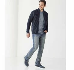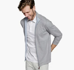 - Birdseye knit smartly styled with subtle contrast details at shoulders, sides, and sleeves.