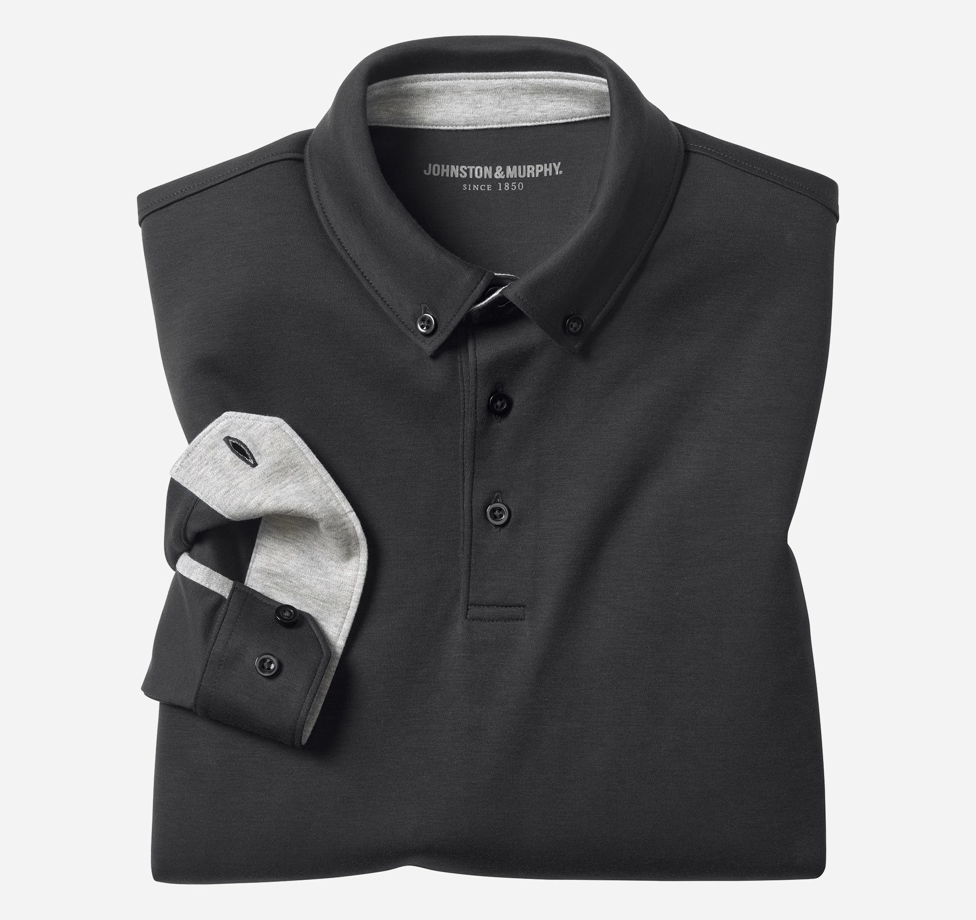 - Hidden button-down polo collar.
