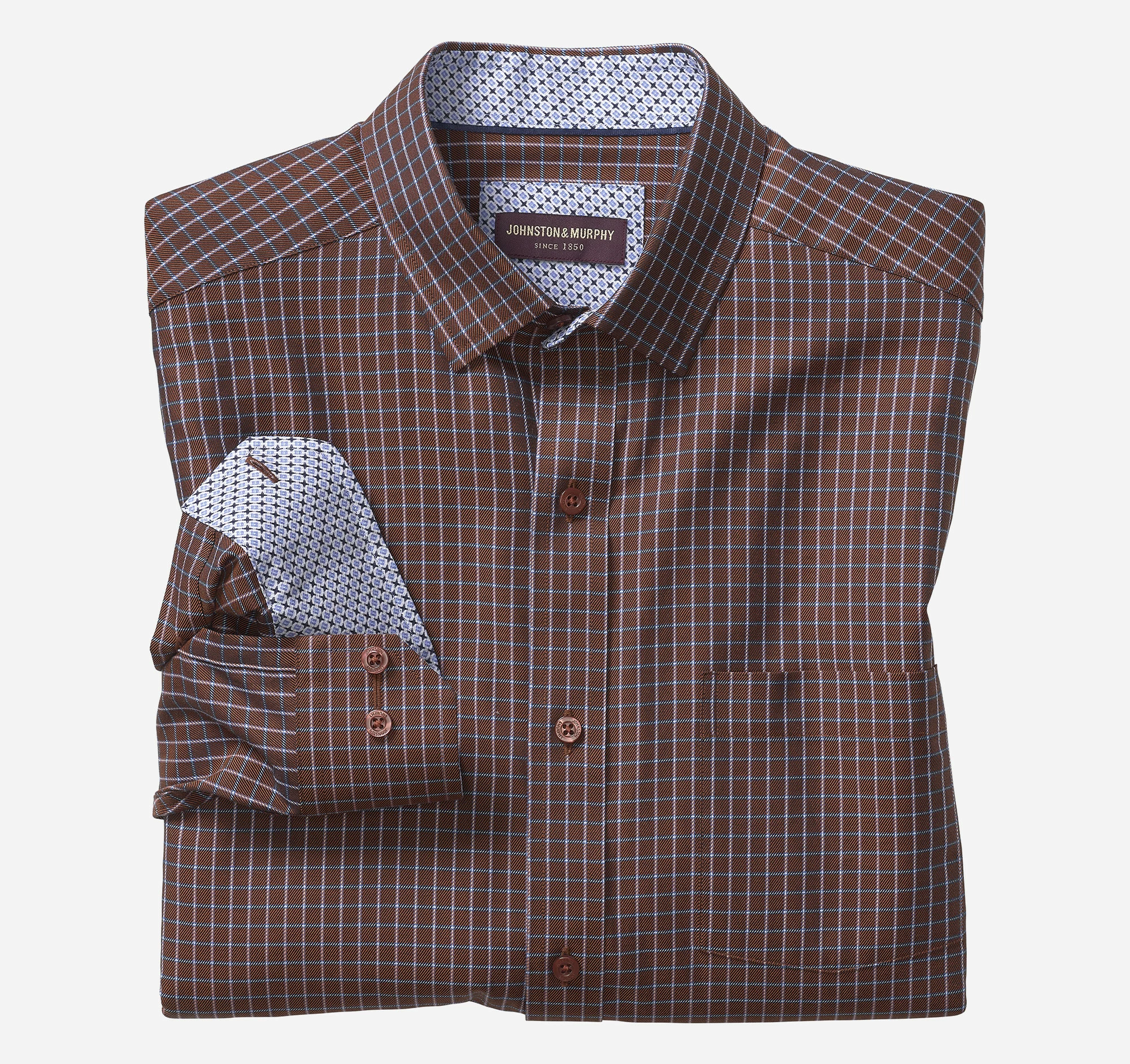 - Contrast facing inside collar and button cuffs on select styles.