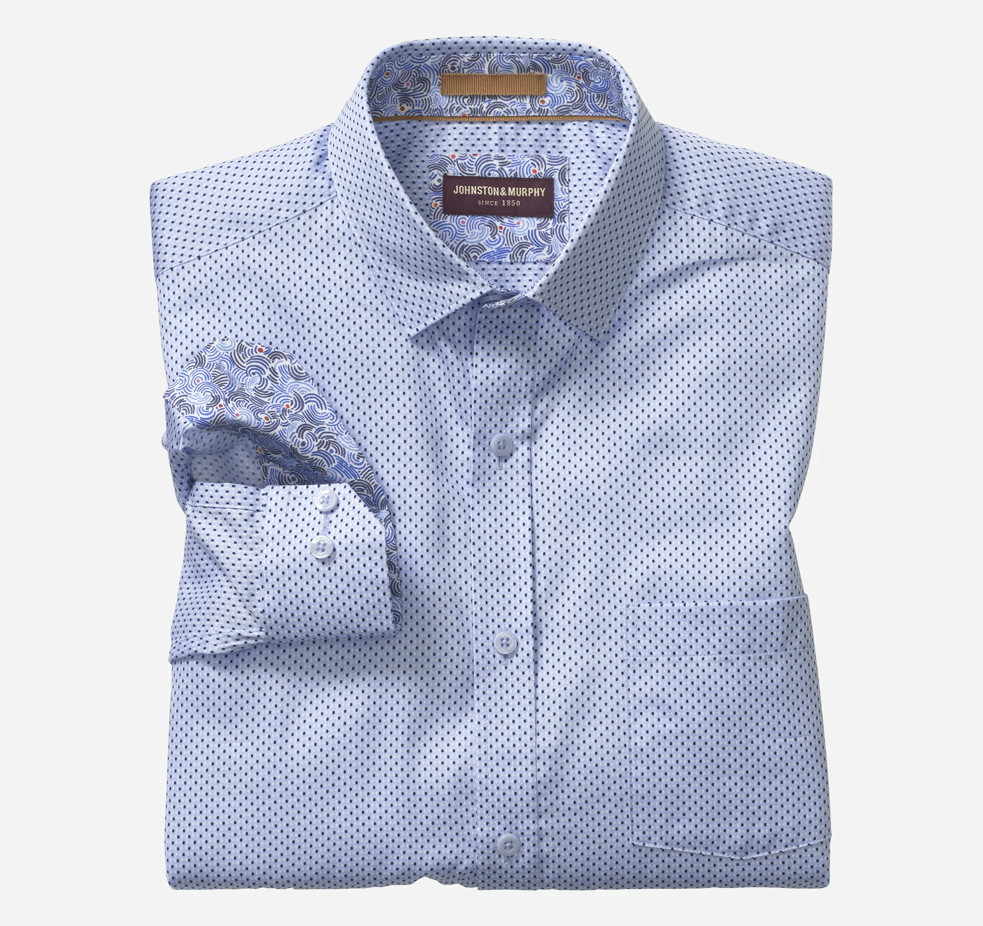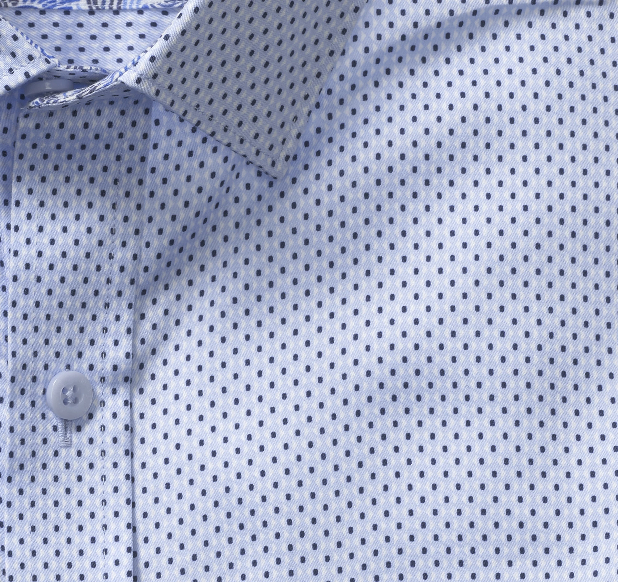 - Point collar with hidden buttons for stay-in-place smoothness.