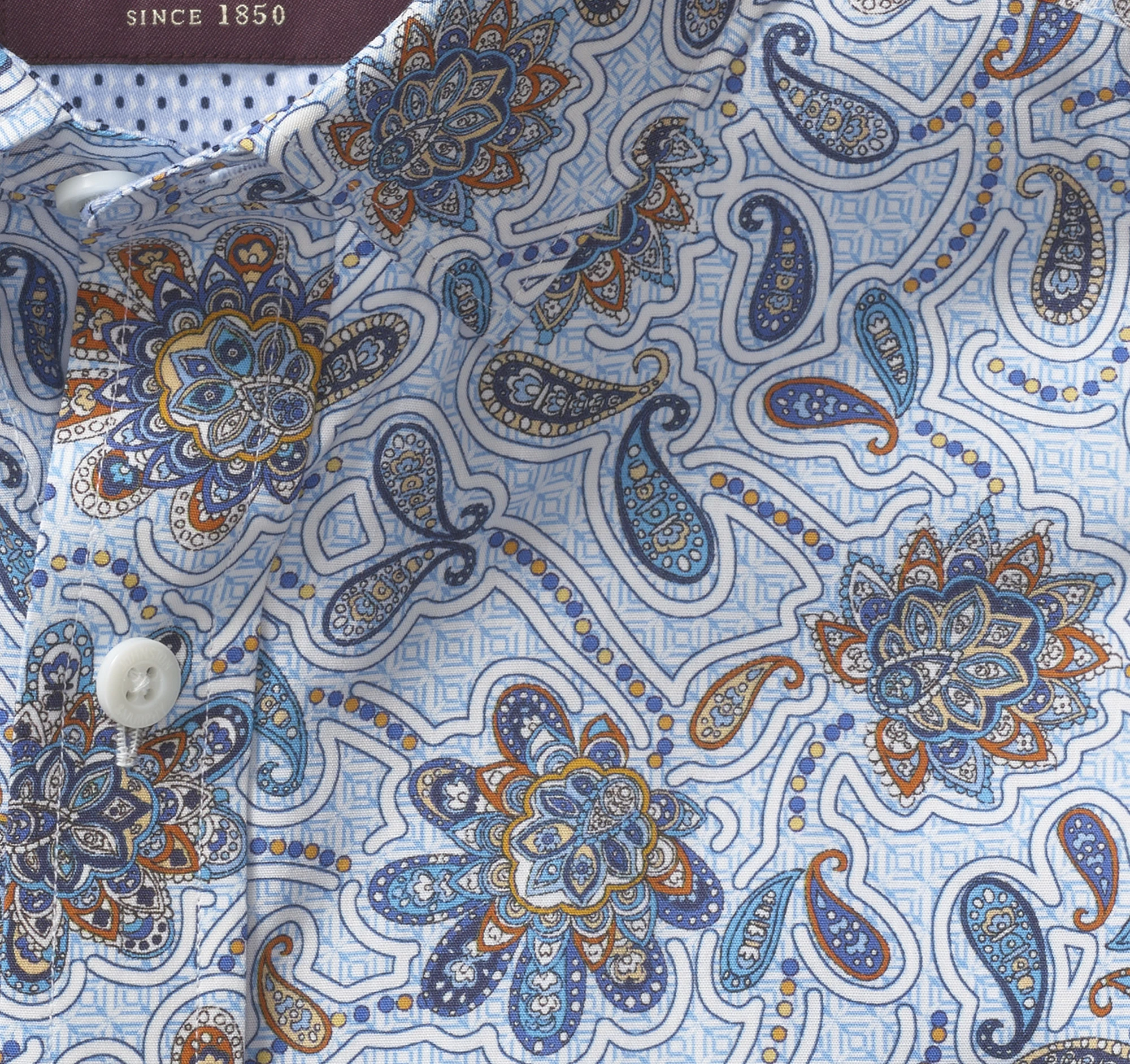 - Point collar with hidden buttons for stay-in-place smoothness.