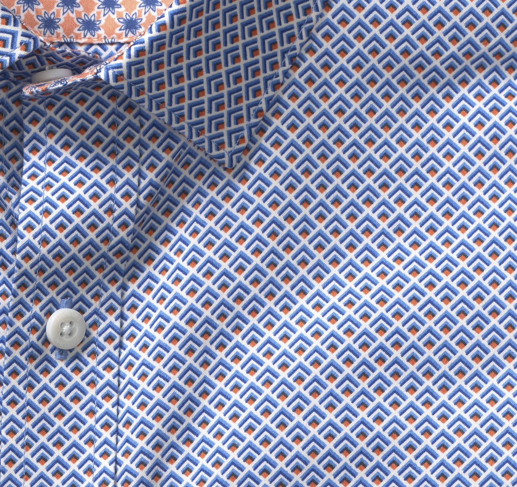 - Point collar with hidden buttons for stay-in-place smoothness.