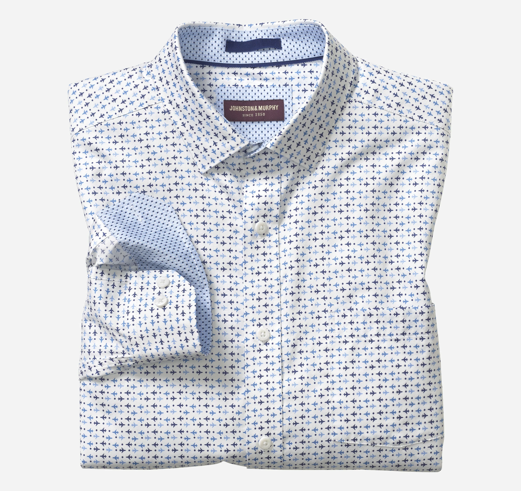 - Point collar with hidden buttons for stay-in-place smoothness.