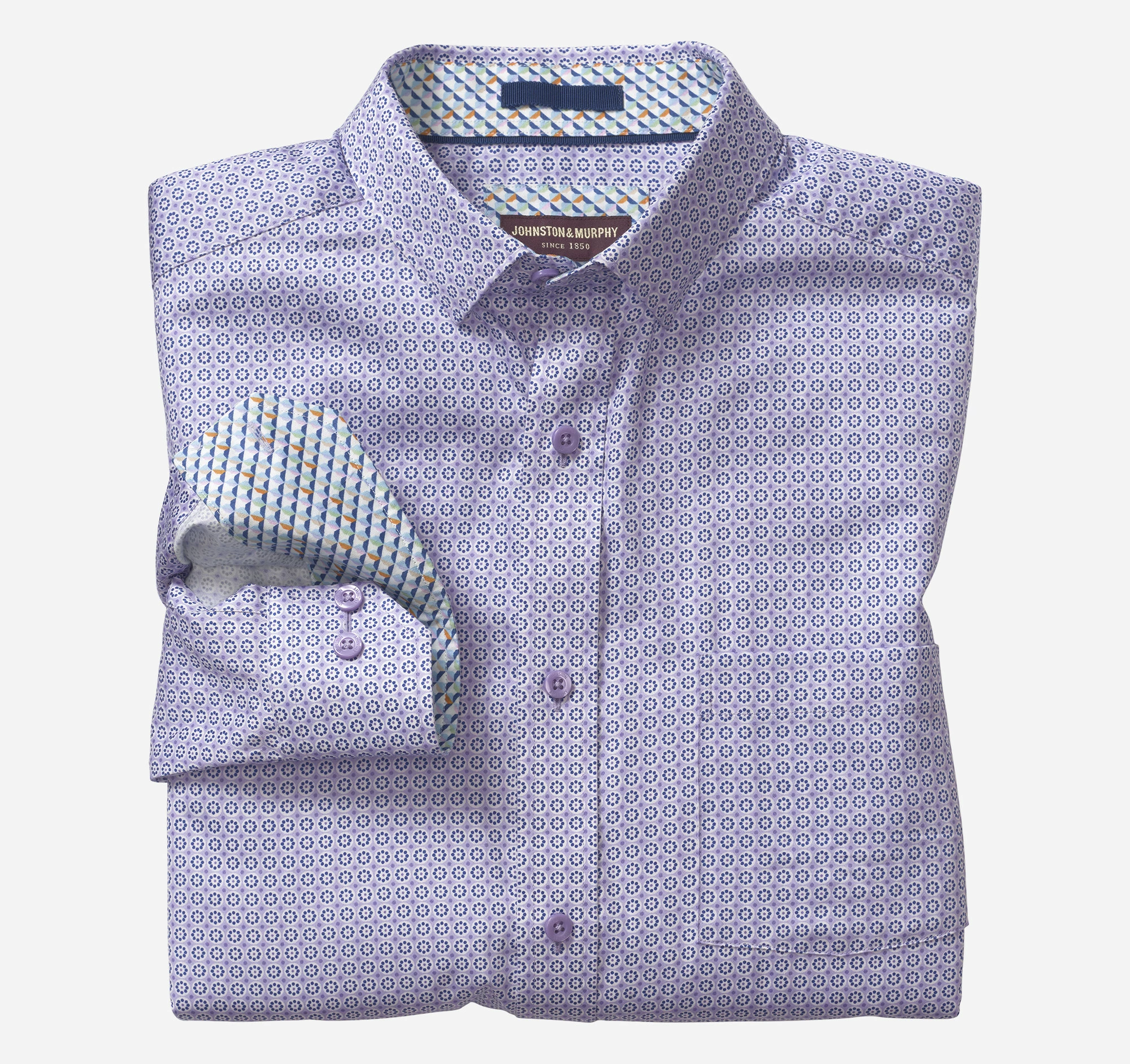 - Point collar with hidden buttons for stay-in-place smoothness.
