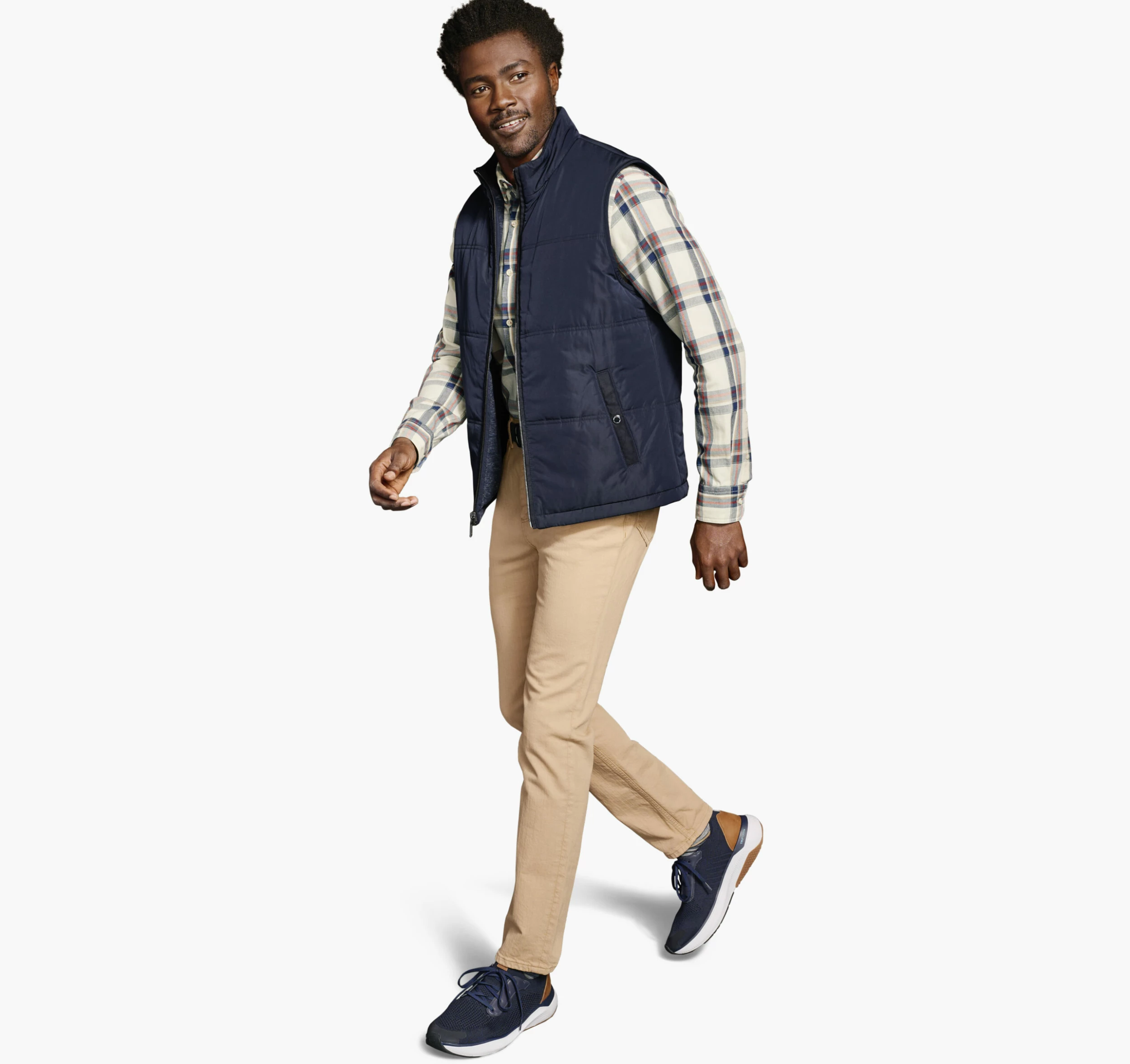 - A lightweight channel-quilted solid woven reverses to a heathered pique knit.