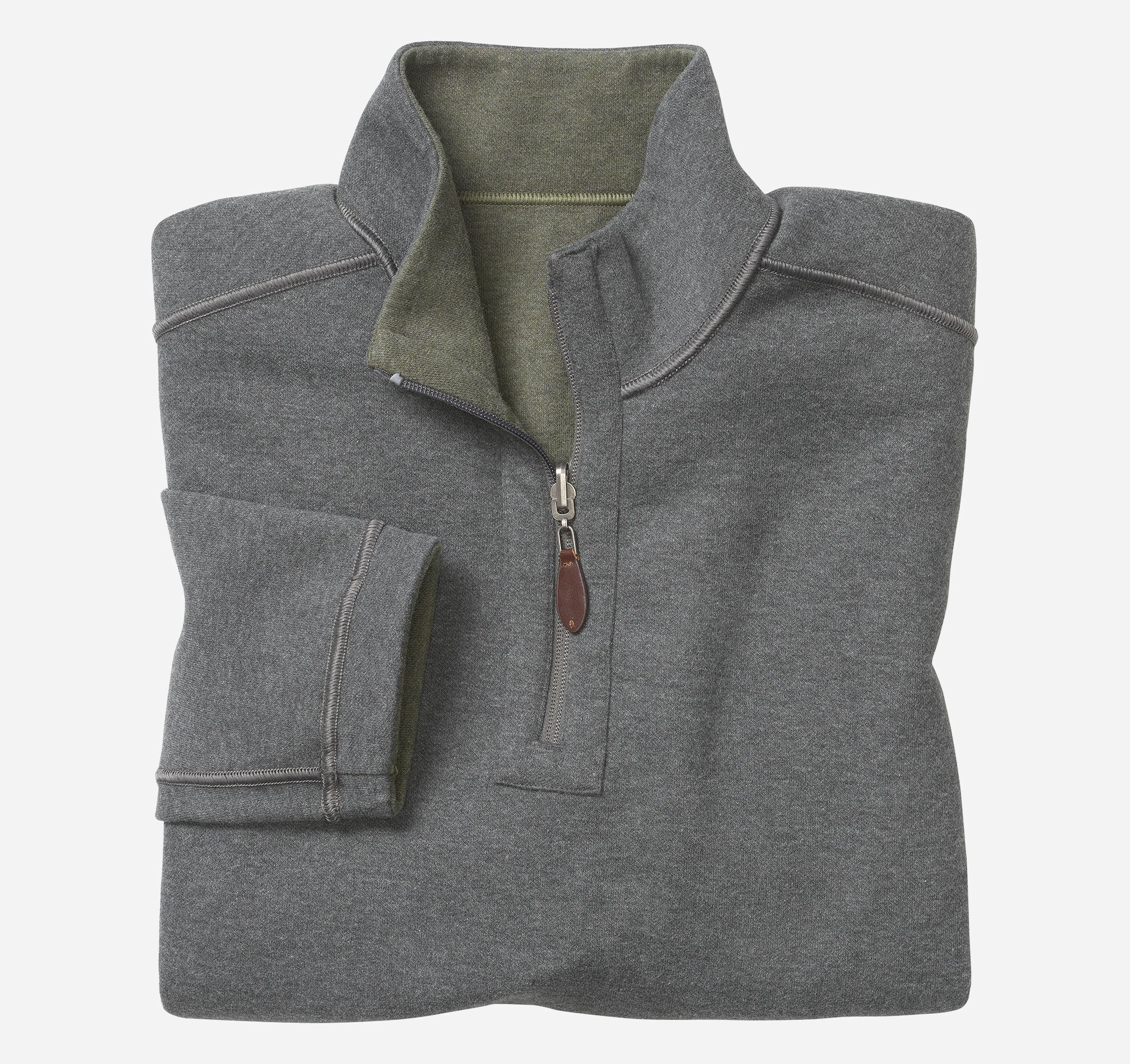 - Quarter-zip placket with leather-look pull.