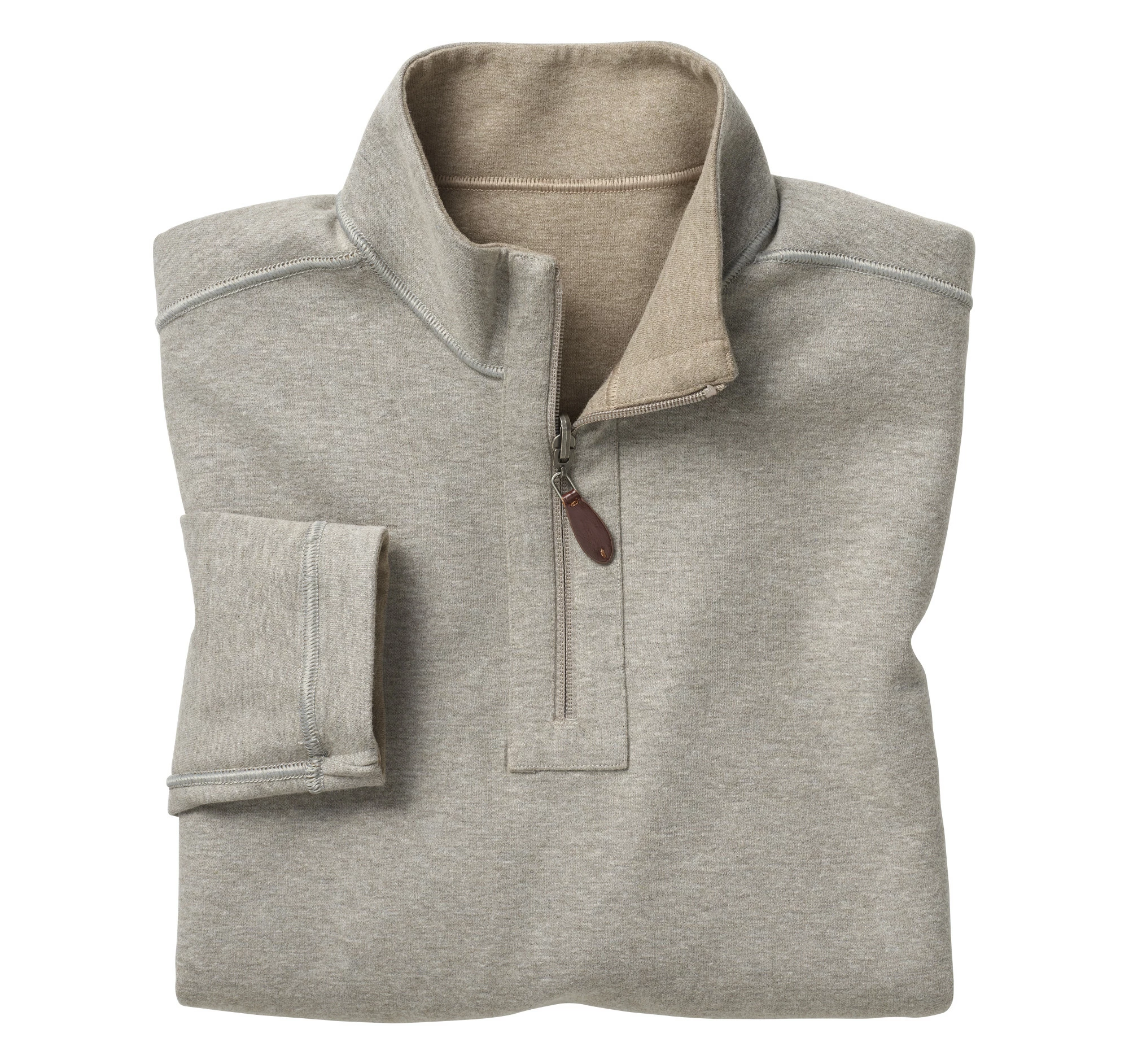 - Quarter-zip placket with leather-look pull.