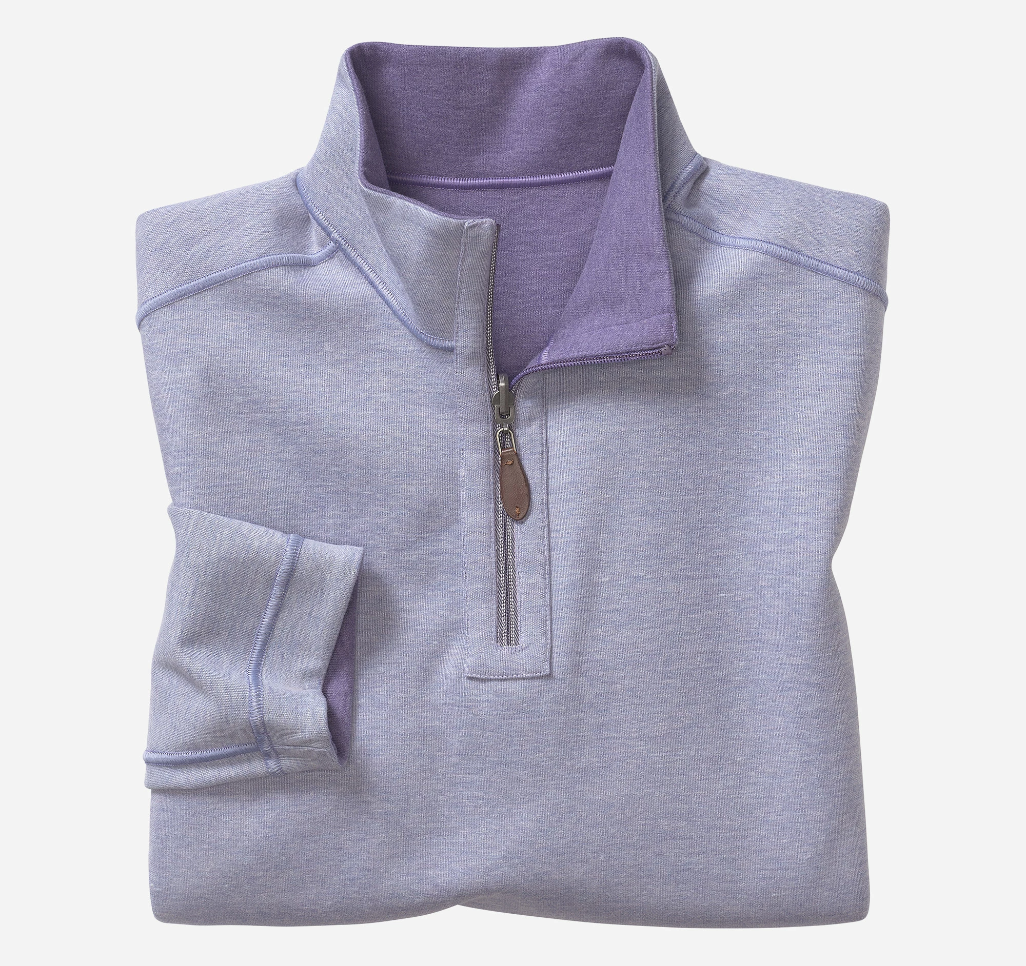 - Quarter-zip placket with leather-look pull.