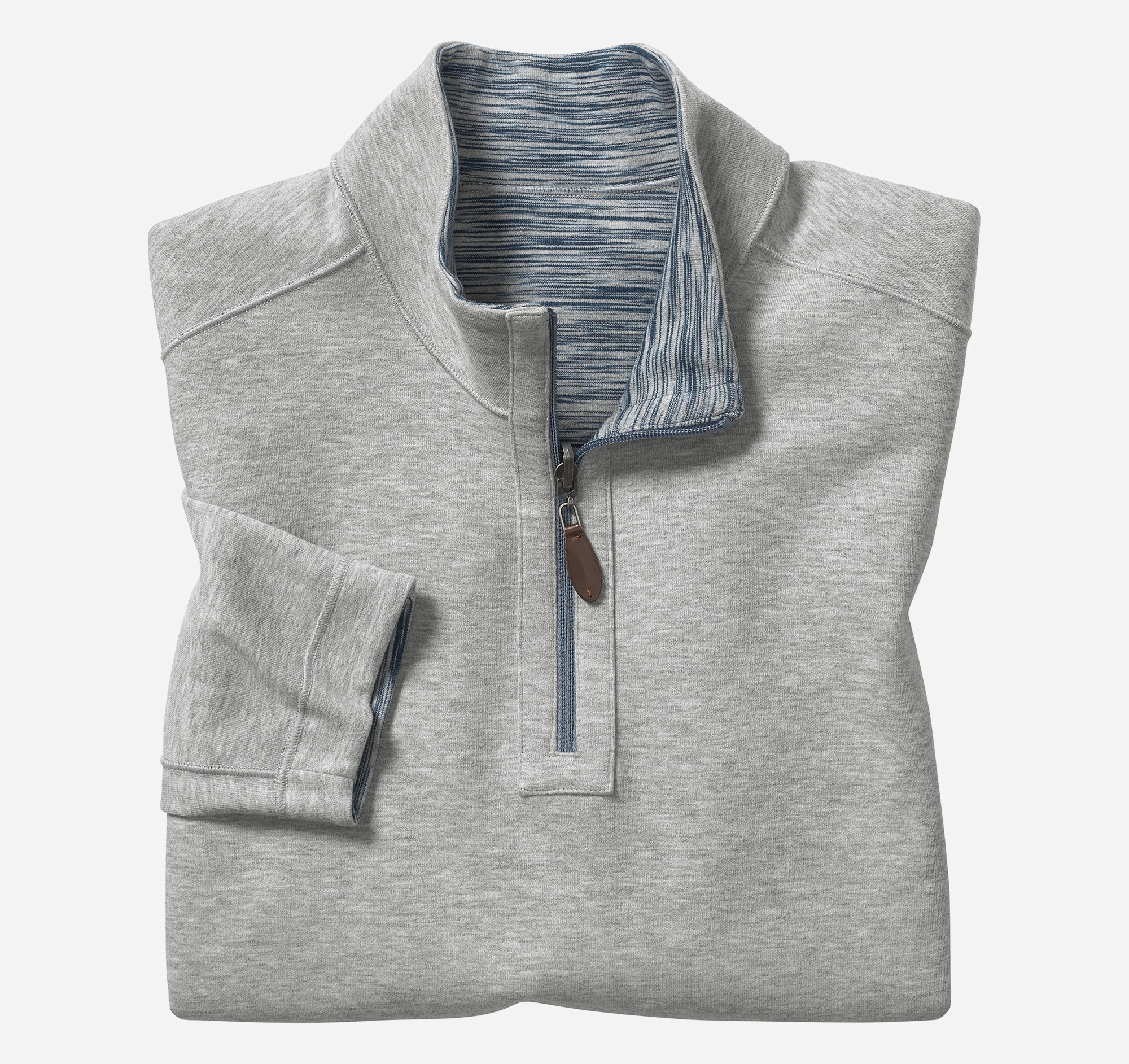 - Quarter-zip placket with leather-look pull.