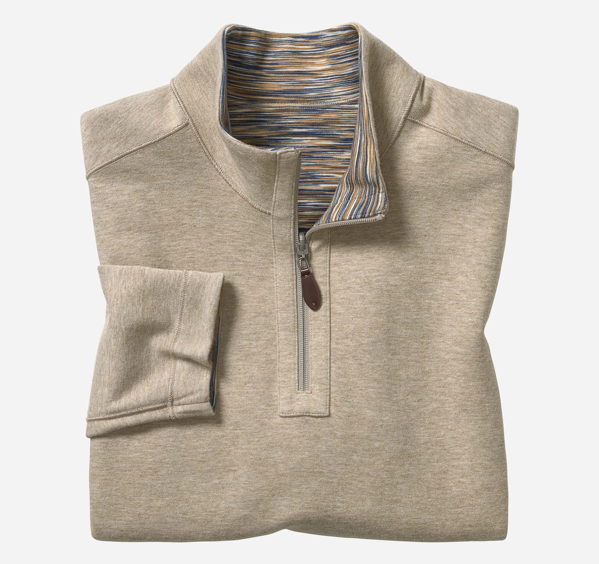 - Quarter-zip placket with leather-look pull.