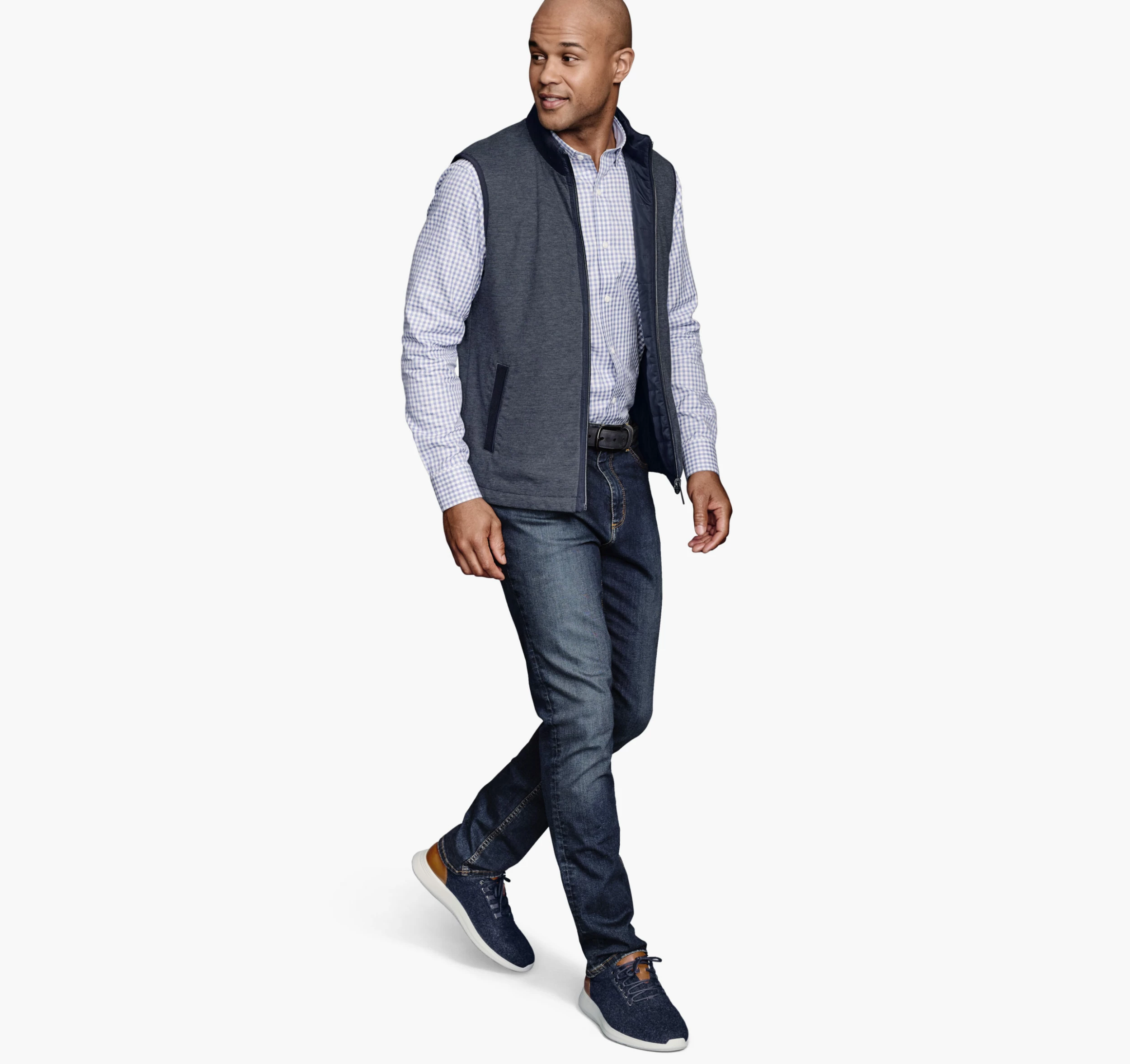 - Soft, heathered cotton/poly knit with welt pockets reverses to sleek, quilted woven poly with zip pockets.